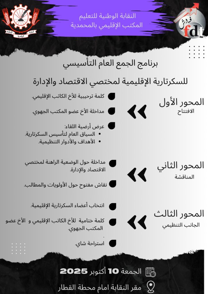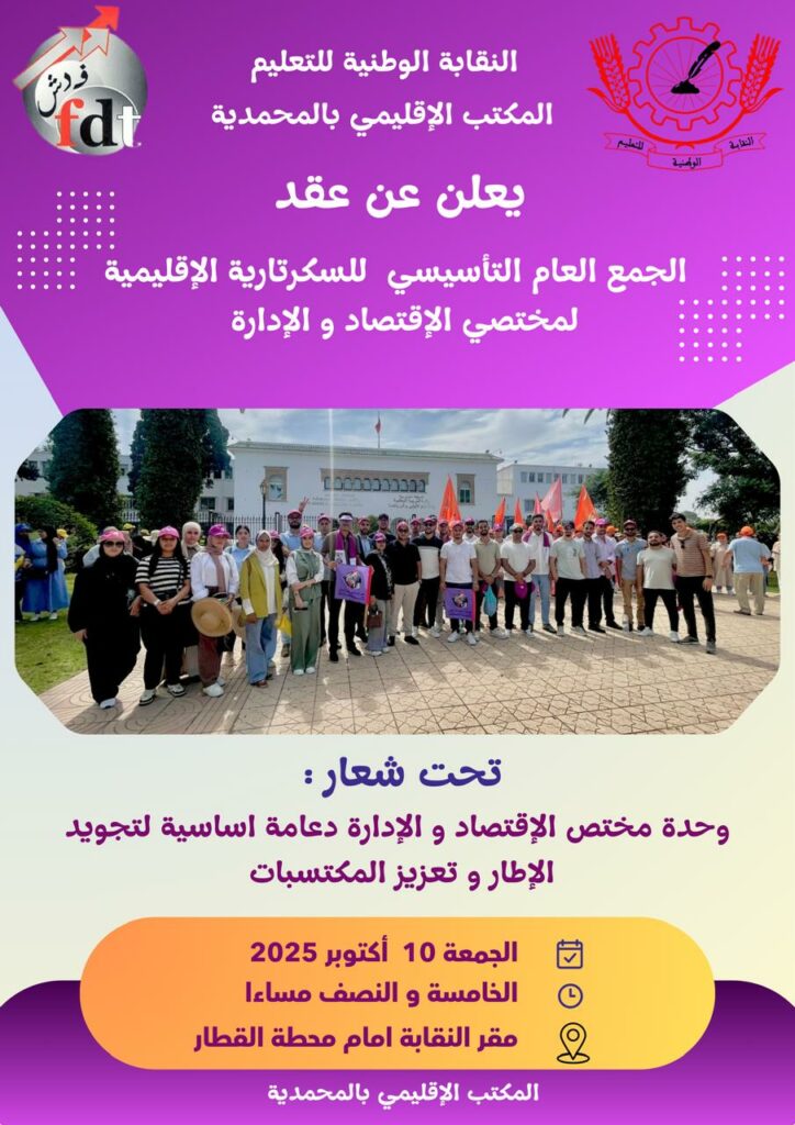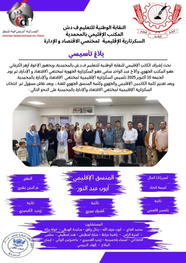 شهد يومه الجمعة 10 أكتوبر 2025 على الساعة الخامسة و النصف مساءا بمقر النقابة الوطنية للتعليم ف د ش بالمحمدية تأسيس السكرتارية الإقليمية لمختصي الاقتصاد و الإدارة، و جاء ذلك نتيجة الدينامية التنظيمية التي تخوضها النقابة الوطنية للتعليم (ف.د.ش)، على الصعيد الوطني و الجهوي خاصة على مستوى فئة الاقتصاد و الإدارة ، هذه الأخيرة التي آمنت بدور الفيدرالية الديمقراطية للشغل كتنظيم قادر على استيعاب مشاكلها و الدفاع على مطالبها وطنيا و جهويا و محليا.