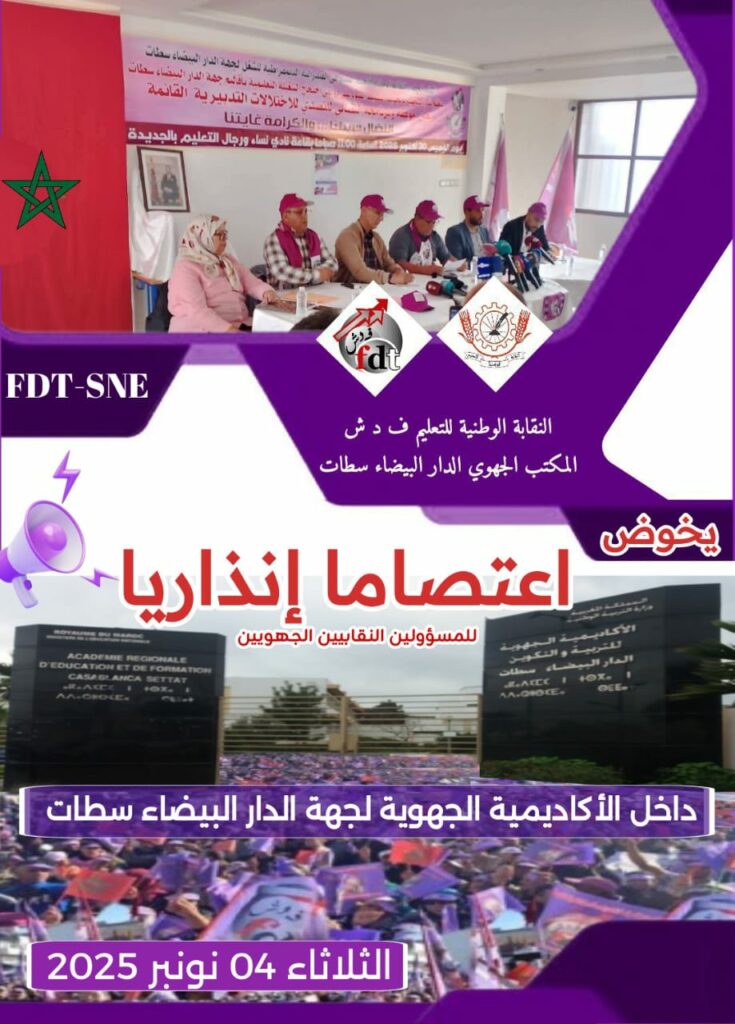 أعلن المكتب الجهوي للنقابة الوطنية للتعليم العضو في الفيدرالية الديمقراطية للشغل بجهة الدار البيضاء سطات أمس الخميس 30 أكتوبر 2025 عن خوض اعتصام انذاري داخل الأكاديمية الجهوية لجهة الدار البيضاء سطات و ذلك يوم الثلاثاء 4 نونبر 2025 لمواجهة الاختلالات التي تعرف الأكاديمية و كذا بعض المديريات الاقليمية التابعة لها .