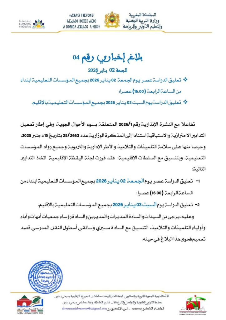 قررت المديرية الاقليمية لقطاع التعليم بسيدي بنور من خلال بلاغها رقم 04 الصادر ظهر اليوم الجمعة 2 يناير 2026 تعليق الدراسة بداية من الساعة الرابعة مساء لنهار اليوم على أن تستأنف يوم الاثنين 5 يناير 2025.