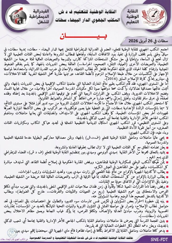 وفي ختام بيانها، جددت النقابة تضامنها مع مختلف الفئات التعليمية، مؤكدة استعدادها لخوض أشكال نضالية تصعيدية في حال استمرار تجاهل مطالبها، ودعت في المقابل إلى فتح حوار جدي ومسؤول، مع التعجيل بتنفيذ مخرجات لجان التقصي وترتيب المسؤوليات.